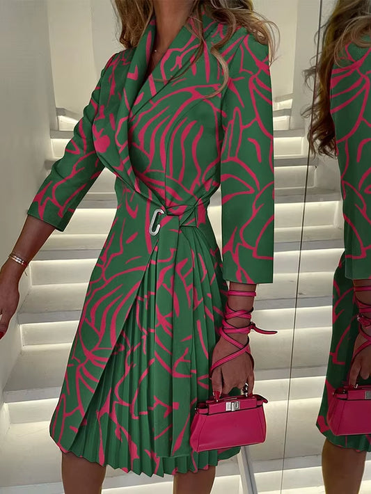 Velvet Dusk: Autumn V-Neck Cinched Waist Printed Dress